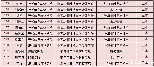 2021年湖南省专升本拟录名单已全部公示,我院2021年“3+2”专升本实际参考420 人(含免试推荐9人),本科院校拟录183人,拟录率43.6%。其中一本拟录50人、二本拟录87人、三本拟录46人。现将拟录名单公告如下: