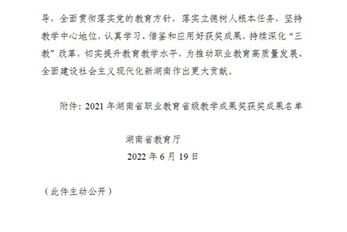 根据省教育厅发布的通知显示,2021年湖南省职业教育省级教学成果奖,共评选出获奖成果300 项(含中高职),其中特等奖20项,一等奖60 项,二等奖90 项,三等奖130 项。我院此次推荐申报的3个项目全部获奖,获奖数量创历史新高。这是学院多年来始终坚持教学改革、教师们潜心耕耘所取得的喜人硕果,未来希望各项目团队再接再厉,争取再创佳绩。