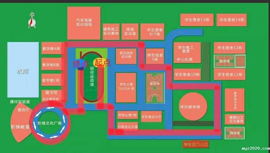 田径场主席台对面的彩色阶梯—9栋—行政办公大楼—校门口—垃圾场—数控实训车间—10栋宿舍南侧上坡—风雨棚篮球场东侧—风雨棚篮球场北侧—二食堂东侧【从5栋这边过】—旱接实训室—驾校—ABCD栋—阶梯文化广场环绕一圈—田径场主席台。