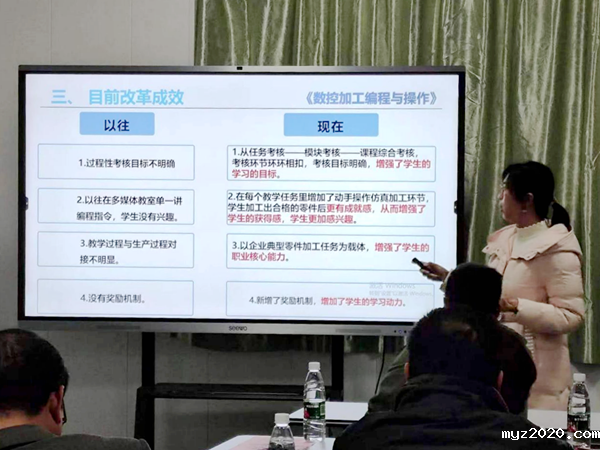 王庆云汇报机电工程系教育教学改革情况周琪老师以《数控加工编程与操作》为例,从前期准备、实施过程、目前改革成效三个方面作模块化教学改革汇报。重点以“企业典型零件加工任务”为例,采用任务驱动法,通过“教学做”一体教学模式来展示模块化教学实施过程。