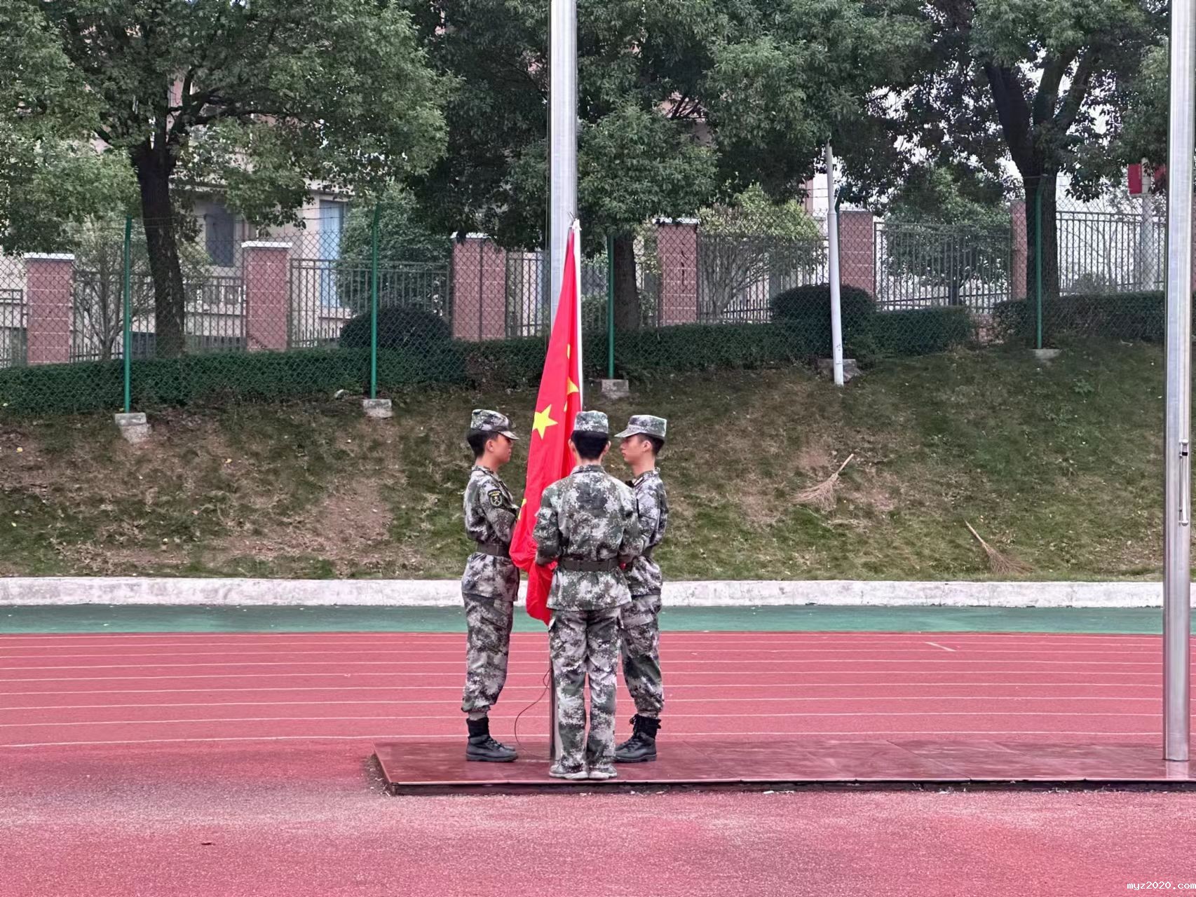 上午7点整,升旗仪式正式开始,伴随着雄壮激昂的《义勇军进行曲》,鲜艳的五星红旗冉冉升起,随风飘扬。现场师生庄严肃立,齐唱国歌,行注目礼。