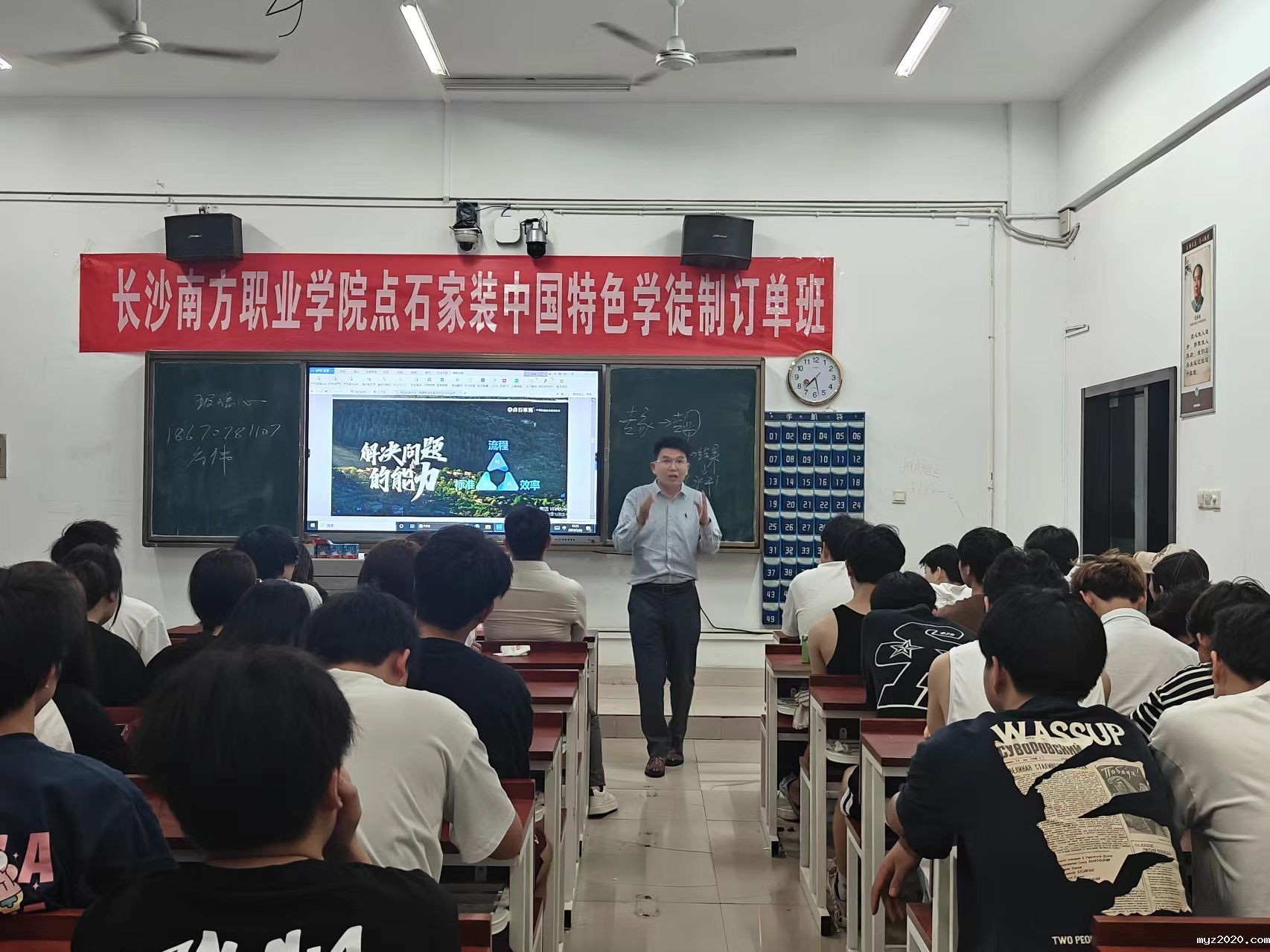 孙振以“你的人生目标是什么?”提问,围绕“如何成为一个专业的设计师?”“要成为一个怎样的设计师?”“如何成为一名优秀的设计师?”等话题,从设计服务、施工工艺、家装选材、木作定制、环保品质、交付验收、售后服务“7大高标准”“一体化家居解决方案”等内容展开授课,引发学生思考、交流,开启第一堂课。