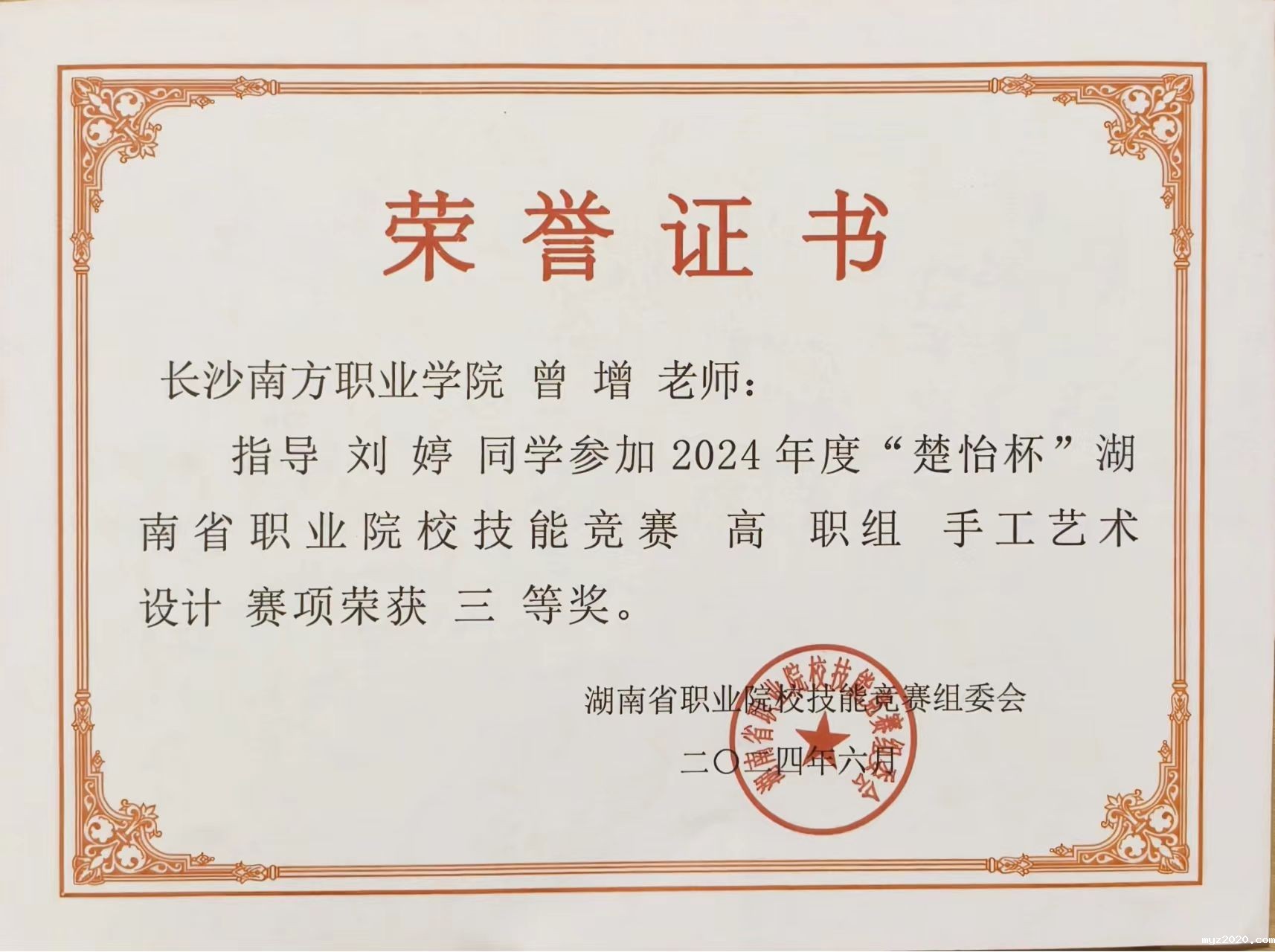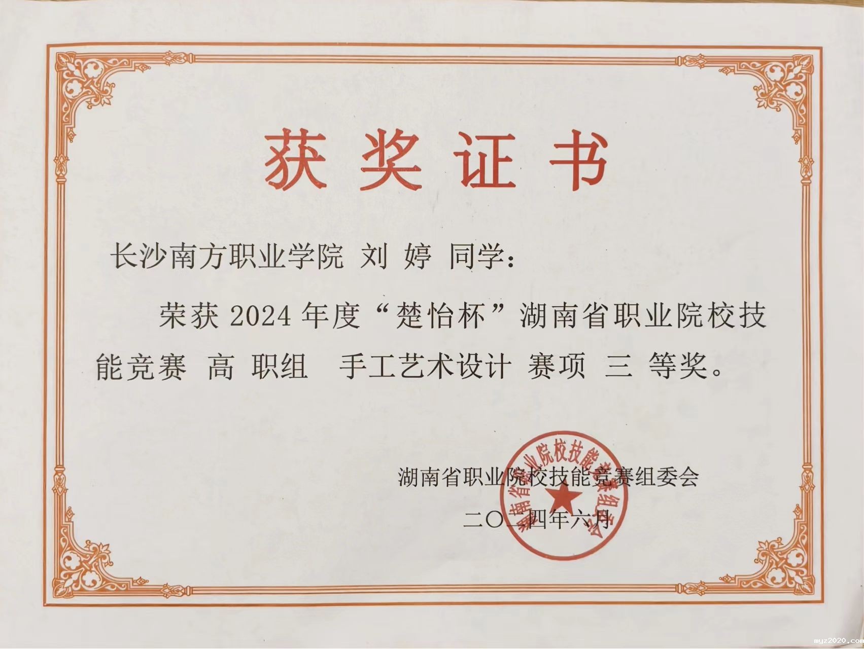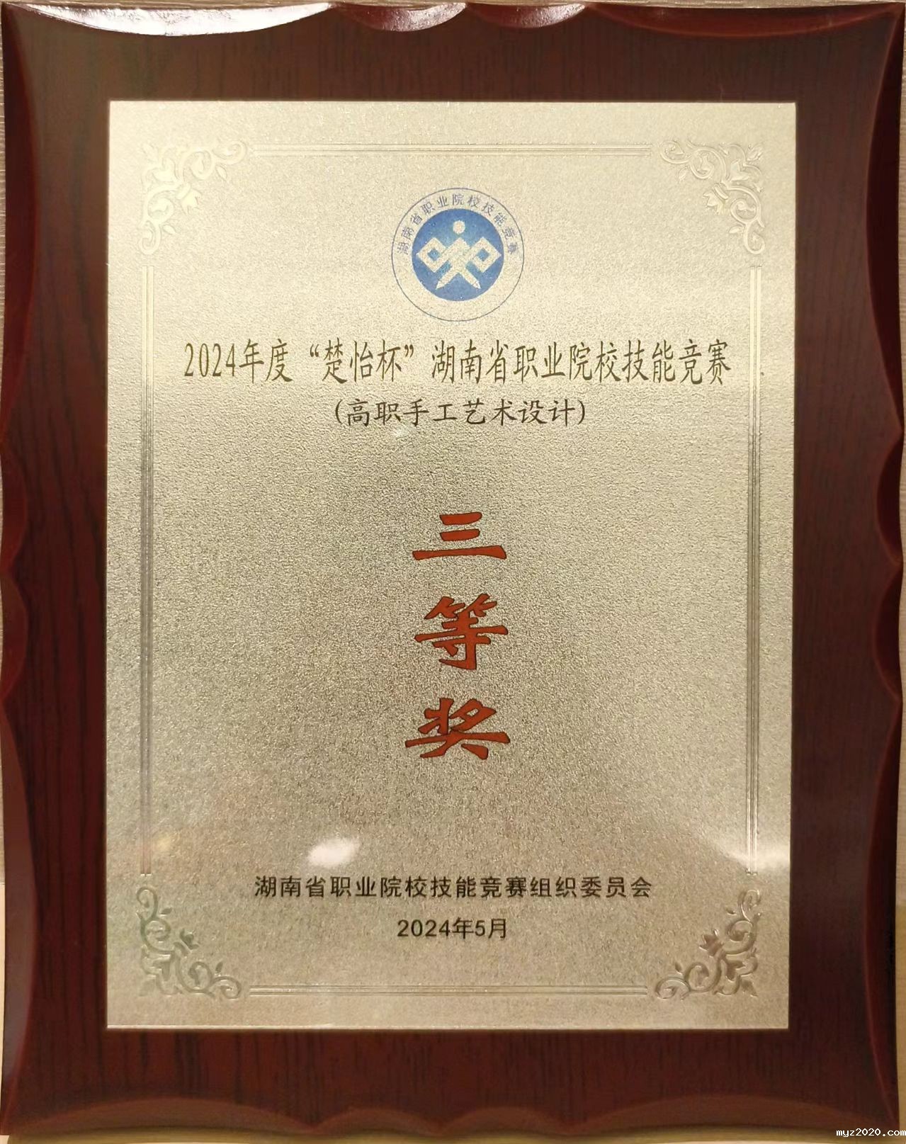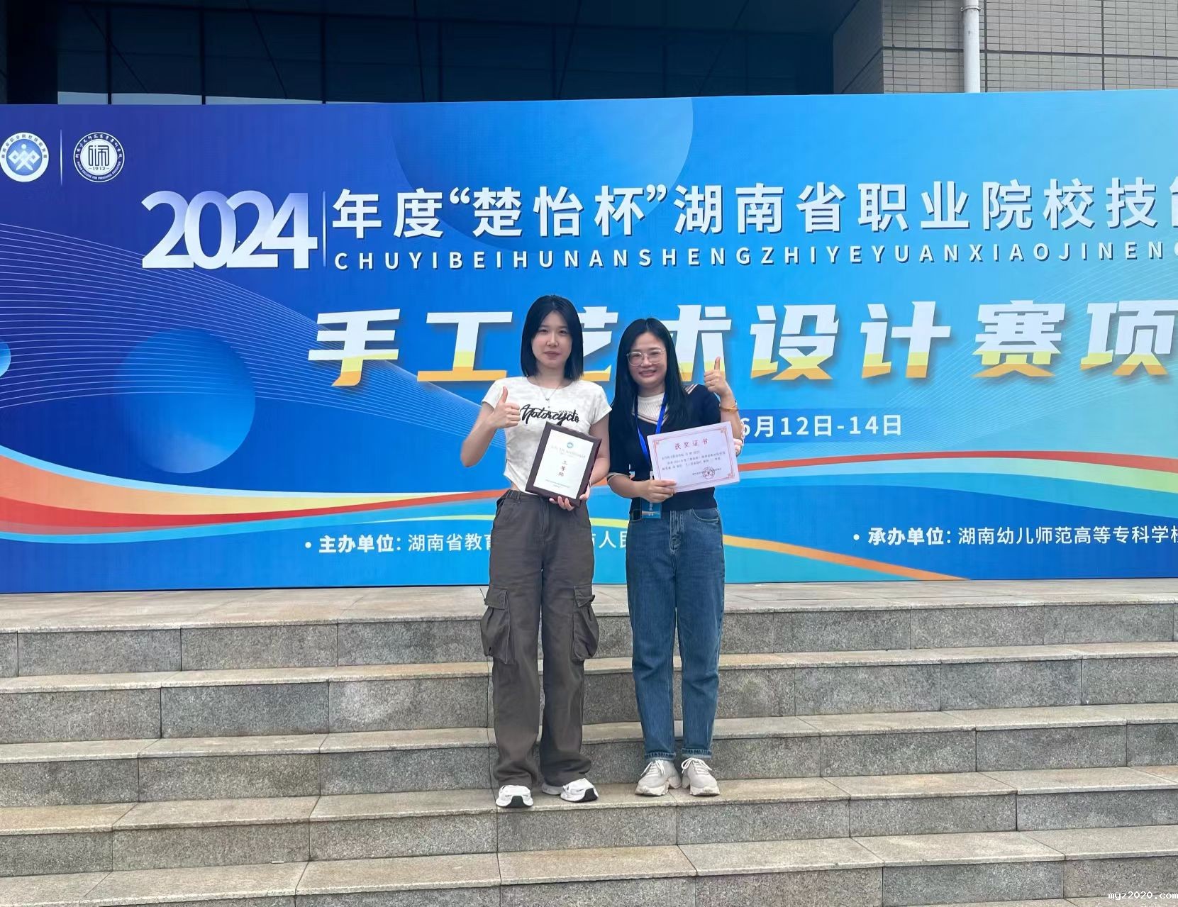 6月13日,2024年度“楚怡杯”湖南省职业院校技能竞赛手工艺术设计赛项,在湖南幼儿师范高等专科学校落下帷幕,我院学生刘婷(建筑室内设计专业)荣获该赛项三等奖。