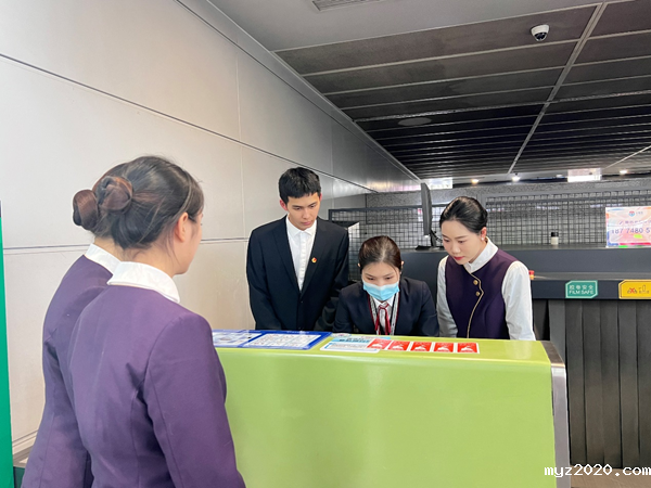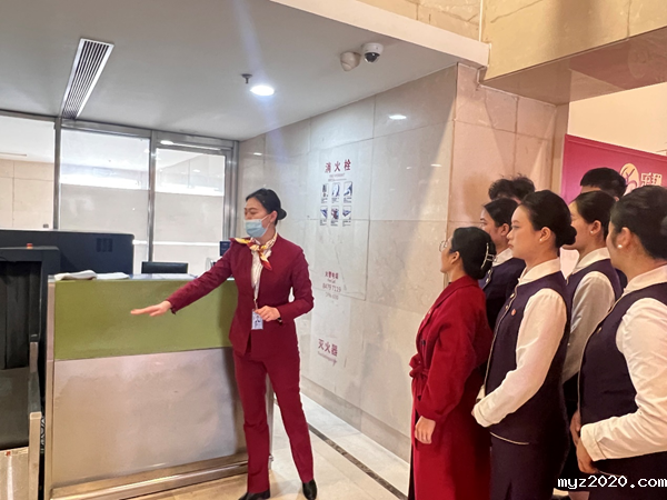 除了繁忙的值机柜台,问讯处、自助托运柜台、安检通道等都有民航一线工作人员忙碌的身影,旅客流量虽大,但依旧井然有序。在参观机场的过程中,带队老师引导同学们观察各个岗位的职业形象、规范动作及服务细节,并逐步启发学生们将课堂的相关理论与生产现场实践相结合,做到知行合一、学以致用。