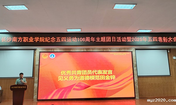 长沙市见义勇为道德模范田金锌同学作优秀共青团员代表发言,他分享了见义勇为的初心与感悟,号召同学们以实际行动诠释青春担当。“奋斗是青春最亮丽的底色!” 现场青年纷纷表示,将以受表彰的集体和个人为榜样,在新征程中挺膺担当,让青春在强国建设中绽放光芒。