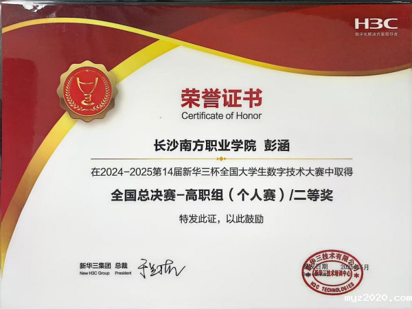 近日,第14届新华三杯全国大学生数字技术大赛——全国总决赛在杭州圆满落下帷幕。我校由张德平老师指导的2023级计算机网络技术专业学生彭涵凭借扎实的技术功底与创新实践能力,从全国千所院校的4万余名参赛者中脱颖而出,荣获全国总决赛-高职组(个人赛)二等奖。这是我校深化“以赛促学”理念的又一硕果,更是学生专业实力的闪耀见证。